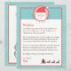 Personalise this north pole mail a letter from Santa with your child's name and text. This design features a Santa face, a brown silhouette of Santa sitting in the sleigh with his 3 reindeers and white polka dots light teal background. On the back is the colouring page of the lettering Merry Christmas and a bear holding a gift.