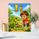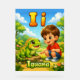 The scene shows a gentle, playful interaction where the child is observing or calmly interacting with the iguana, adding light movement and storytelling to the design without overpowering the letter.