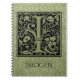 Charming decorative letter I initial monogram calligraphy style typography first letter in black over vintage sage green - avocado green book lining with off white Ginkgo biloba leaves.