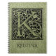 Charming decorative letter K initial monogram calligraphy style typography first letter in black over vintage sage green - avocado green book lining with off white Ginkgo biloba leaves.