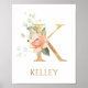Elegant Letter K monogram nursery poster featuring watercolor pink peach rose and green foliage.