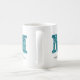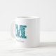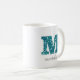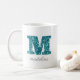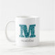 This girly mug has a monogram initial M in an aqua blue glitter pattern and is personalised with your name underneath in a grey script.