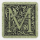 Charming decorative letter M initial monogram calligraphy style typography first letter in black over vintage sage green - avocado green book lining with off white Ginkgo biloba leaves.