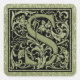 Charming decorative letter S initial monogram calligraphy style typography first letter in black over vintage sage green - avocado green book lining with off-white Ginkgo biloba leaves.