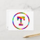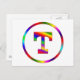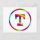 A colourful monogram with the letter T in rainbow colours inside of a rainbow circle. Share your pride of your name with a fun happy initial T.