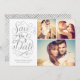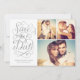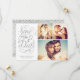 This save the date photo card features a 3-photo collage, swirly hand lettered calligraphy artwork and faux silver metallic foil. Visit our designer shop to see more!