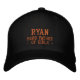 Red lettering embroidered on a hat. Suggested base: white hat.