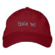 Lettering, embroidery on a hat. Suggestion: red hat with light grey lettering.