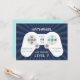 Cool gamer theme birthday party invitations feature a video game controller with "[name] has reached level [age]" displayed in retro lettering, with your party details on the game controller.