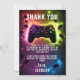Game Over” to your party in style with this neon video game-themed thank you card! Featuring a bold “Game On” design with glowing controllers on a dark background, this card is the perfect way to thank guests for levelling up the fun. Customise with your message and send a cool gaming-inspired note of appreciation. Perfect for any gamer’s birthday or game night! 🎮✨