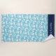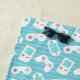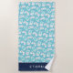 Cute personalised beach towel for your little gamer features a pattern of retro game controllers and handheld video game consoles on a turquoise background, with a name or initial along the bottom.