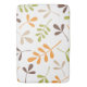 Illustrative surface pattern design of assorted leaf silhouettes in retro colours of brown, orange, green and sand colour on a white background.