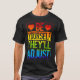 I give wanted to give this a 4 instead of a 5 because these Basic DARK T0shirts run unexpectedly SLIM or Narrow. Which is great if you do not have a potbelly, but I have a paunch. It isn't the shirt's fault that I've got a beer belly. The design and shirt itself is a quality cotton shirt. The color is more of a deep purple, but still a very pretty color. The Basic DARK T-shirts run a bit SLIMMER than the Basic Ts. The neck is a fraction narrower (or seems to be narrower) also. I'm a paunchy middle-aged woman and my neck is 12 inches (31cm) thick and the neckline fell about the same as in the photo of the man, and I had the desire to tug it a bit. So if you're a thick necked man or like loose shirts, be aware these are slimmer shirts. Once I get rid of my lockdown paunch it'll look great. The shirt washed well in cold water with no apparent bleeding. We don't have a dryer, so it hung dry. Did not shrink. Love the colors and the design. The design looks smaller on my shirt than it does on the model on-line. But still, it looks good on the shirt. The printing looks as it does on the model, just the size seems fractionally smaller. Washed garment in cold water, hung dry and design appeared unaffected.