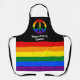 Medium-sized apron with an image of an LGBT pride flag and a peace symbol; red, orange, yellow, green, blue, and purple design on a black background, with a customisable text template for your own name or message