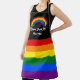 Large apron with an image of an LGBT (lesbian, gay, bisexual, transgender) pride flag and a rainbow; pink, white, and orange design on a black background, with a customisable text template for your own name or message