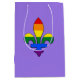 Design with fleur-de-lis (fleur-de-lys or lily flower) symbol with rainbow stripes from LGBT (lesbian, gay, bisexual, and transgender people) flag, gay pride design on purple background