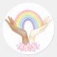 Pride watercolor rainbow colours description and hands in pink flowers over white background. No matter what your orientation is and your skin colour, you are still a human.