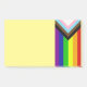 The "Progress" variation of the Rainbow flag adds a chevron along the hoist that features black, brown, light blue, pink, and white stripes to bring those communities (marginalised people of colour, trans individuals, and those living with HIV/AIDS and those who have been lost) to the forefront; "the arrow points to the right to show forward movement, while being along the left edge shows that progress still needs to be made."