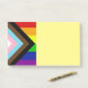 The "Progress" variation of the Rainbow flag adds a chevron along the hoist that features black, brown, light blue, pink, and white stripes to bring those communities (marginalised people of colour, trans individuals, and those living with HIV/AIDS and those who have been lost) to the forefront; "the arrow points to the right to show forward movement, while being along the left edge shows that progress still needs to be made."