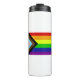 The "Progress" variation of the Rainbow flag adds a chevron along the hoist that features black, brown, light blue, pink, and white stripes to bring those communities (marginalised people of colour, trans individuals, and those living with HIV/AIDS and those who have been lost) to the forefront; "the arrow points to the right to show forward movement, while being along the left edge shows that progress still needs to be made."