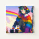 Personalised LGBTQIA+ notebook. Anime girl in headphones with cat ears, a rainbow sweater and socks sitting outside.
