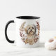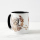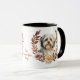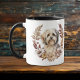 A pretty autumn wreath in tones of cinnamon brown, tan, and cream surround the watercolor image of an adorable Lhasa Apso dog. The image is printed twice on the mug, with your custom text between them.