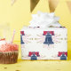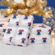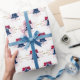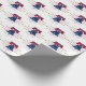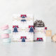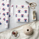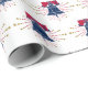 The Liberty Bell wrapping paper has an illustration of the Liberty Bell with stars coming out from the centre as if it were ringing. Patriotic colours in red, blue, and gold colours on a white background.