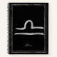 Stylised hammered silver Libra astrology zodiac birthday symbol in a hand drawn silver fine double line frame. A hardcover or softcover notebook with your choice of inside pages. Choose from sketchbook, bullet journal, checklist, graph paper, recipe book, or lines in various widths and colours. Customisable. Aquarius text in a fine script on the front cover can be personalised, text can also be added on the back.