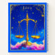 Journal in an illustration of the zodiac sign Libra, symbolised by golden scales set against a deep blue starry sky, resting on colourful, dreamy clouds. The scales represent balance and harmony. The celestial scene reinforces Libra’s association with fairness, aesthetics, and cosmic equilibrium