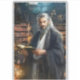 The image depicts a regal, wise-looking man with long silver hair and a flowing beard, dressed in elegant black and white robes that hint at a scholarly or mystical background. He stands in a grand, dimly lit library filled with tall bookshelves crammed with old tomes. The man holds an open book in his hands and gazes intensely forward, exuding a sense of authority and deep knowledge. Faint magical glows and sparkles can be seen near him, suggesting a magical or arcane setting. The overall atmosphere is mysterious and intellectual, combining elements of fantasy and ancient wisdom.