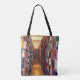 This tote bag will take you on a walk down a long aisle of books in the stacks of a huge library. The bright lighting reveals book spines in a kaleidoscope of colours: red, green, blue, black, white, gold, brown, purple. The symmetrical angle creates a geometric abstract pattern that seems to lead to infinity.