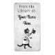 Custom 'Library of" bookplates with script and retro letters and vintage art of a stylish black cat in a coat wearing glasses tipping his top hat, on a faux grunge canvas background.