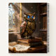 A clockwork owl with saphhire eyes is perched on a stack of books in an old library. Dust, or perhaps smoke from overheated servos, rises around it. Very nice steampunk image!