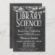 A fun black and white chalkboard library science graduation party invitation with glowing lights at the top.