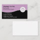 Eye catching licensed massage therapist business card template in purple, black, and white with unique massage emblem and modern design layout you can customise online. Designed for a masseuse, sports physical therapist or day spa.