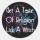 This one has been around for a while: "Get a taste of religion. Lick a Witch." Great way to introduce alternative spiritual choices by making non-witches smile and realise differences are not a threat, but instead help create a diverse, more tolerant world.
