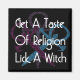 This one has been around for a while: "Get a taste of religion. Lick a Witch." Great way to introduce alternative spiritual choices by making non-witches smile and realise differences are not a threat, but instead help create a diverse, more tolerant world.