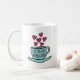 Anything before your first cup just doesn't count. Our cute and charming mug design features the quote "life begins after coffee" inscribed on a hand drawn aqua coffee mug with steaming pink hearts rising from the top. A sweet gift for your favourite coffee lover or java addict!