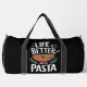 This black duffle bag features a fun, food-themed design with a bowl of pasta garnished with tomatoes and herbs, and the text "LIFE is BETTER with PASTA." This quirky design is perfect for Italian food lovers and pasta enthusiasts. Edit colour of the bag caps and body in the Design tool to your favored colours.
