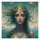 A serene aquatic scene features a woman surrounded by swirling water and fish, her hair flowing gracefully around her. Light filters through the water, highlighting her ethereal and mystical presence.