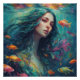 A serene underwater scene features a young woman with long, flowing teal hair surrounded by vibrantly coloured fish. The setting exudes a mystical and dreamlike atmosphere with the interplay of light and water.