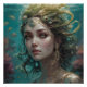 A serene aquatic scene features a woman surrounded by swirling water and fish, her hair flowing gracefully around her. Light filters through the water, highlighting her ethereal and mystical presence.