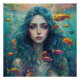 A serene underwater scene features a young woman with long, flowing teal hair surrounded by vibrantly coloured fish. The setting exudes a mystical and dreamlike atmosphere with the interplay of light and water.