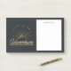 Landscape orientation post-it notes with a gold coloured illustration on a black-grey background. Designed with an illustration of a mountain with the suns rays shining outward from behind. Typography says: Life is an Adventure explore dream discover.