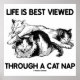 Showcase your cat attitude toward life and naps with this poster featuring three snuggling/snoozing cats along with the saying "Life Is Best Viewed Through A Cat Nap".