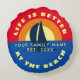 Life is better at beach nautical sail ship sunset custom family name Round Pillow. Trendy decoration cushions and accessories for boat, beach home, sailing ship, lake house, nautical interior, seaside cabin etc. Beautiful home decor gift ideas for bedroom, office, sofa, bed, chair etc. Elegant Birthday presents for newly weds couple, friends, family, bride and groom. Tropical summer sunset destination with sailing boat silhouette, red sky, orange sun and blue ocean water. Add your own funny quote, surname and established date year.