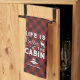 This rustic family cabin kitchen towel is the perfect finishing touch for your cabin kitchen. The design features the phrase "Life is Better at the Cabin" with accents of an arrow, deer and forest pine trees. The background in a red and black buffalo check plaid framed by rustic wood. Personalise with your family name and year established.