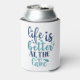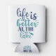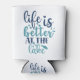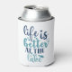 It's always nice to get away and relax and you can keep your beverage cold with this trendy life is better at the lake in blue scrip font.