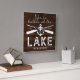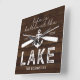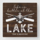 Rustic lake house wall clock featuring a wood effect printed background, the fun saying "life is better at the lake", boat oars, an anchor, your family name, and year established.