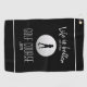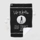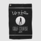 This classic black and white golf towel features the quote “Life Is Better at the Golf Course” in clean white handwritten script, paired with a customisable name or monogram below. A lady golfer silhouette and realistic golf ball graphic add a stylish, sporty touch, while two thin white accent stripes create a polished, modern finish.